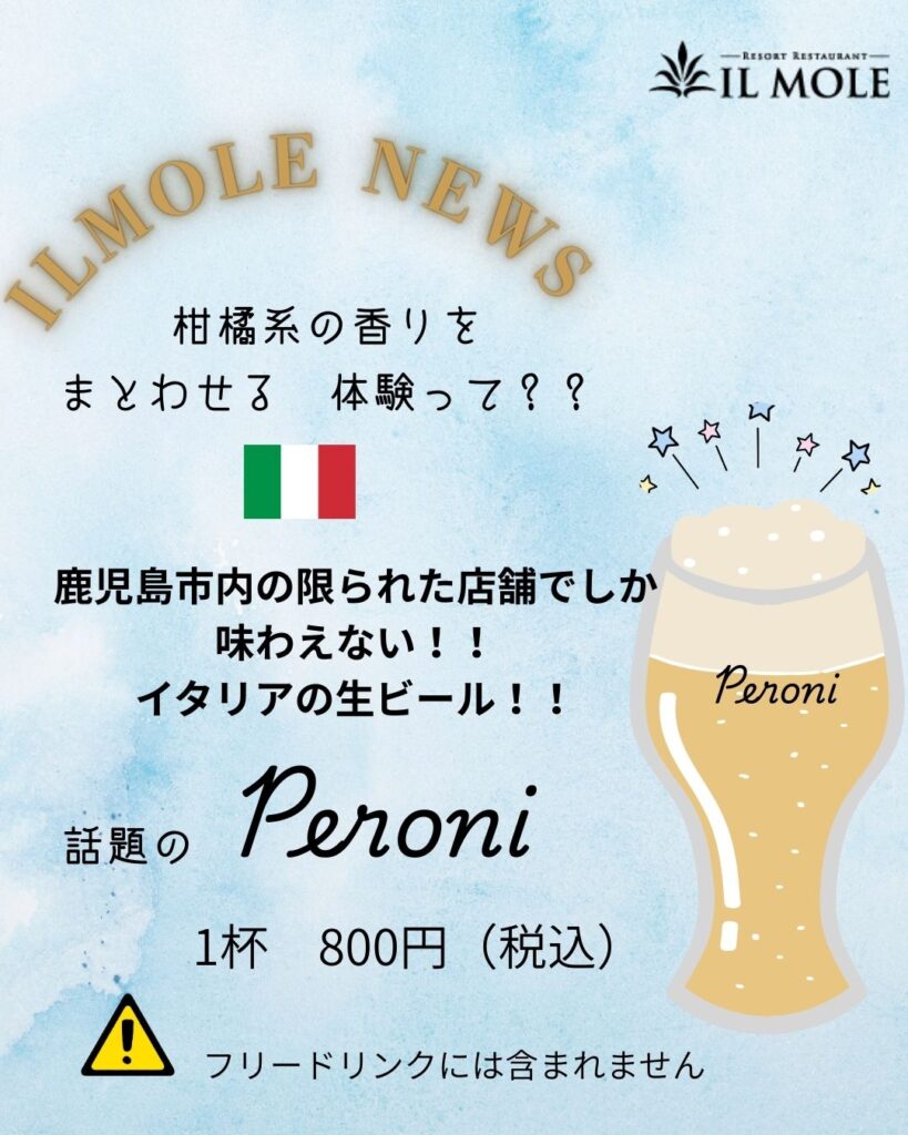 (※ペローニはお一人様1杯まで。追加注文は1杯800円にてご提供いたします。フリードリンクには含まれません。)